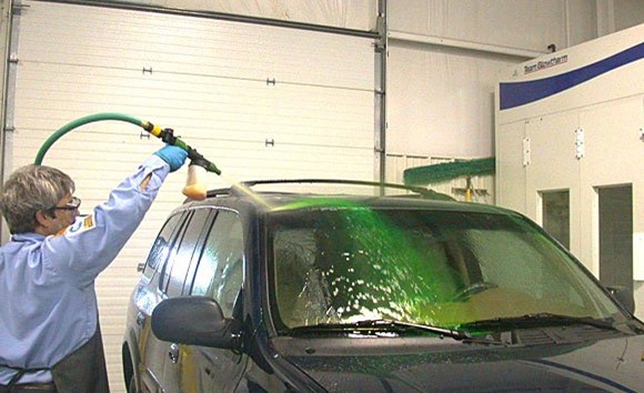 將按照一定比例稀釋的水性熒光檢漏劑添加到LUYOR-3030熒光劑儲液瓶中,開啟開關(guān),熒光劑將和水按照一定比例噴射在車身上面。如果模擬汽車在高速行進在大雨中,需將熒光劑儲液瓶卸下,將熒光劑按照一定濃度比例稀釋好,用高壓模式噴射在車身表面。